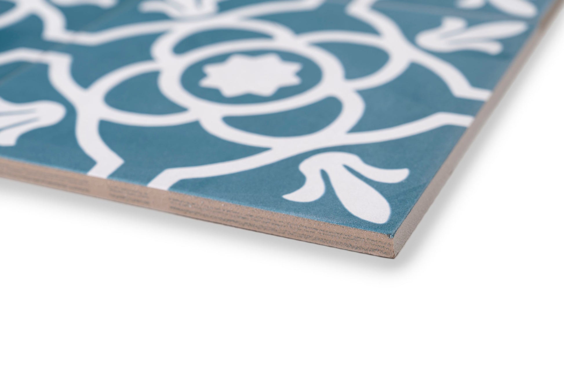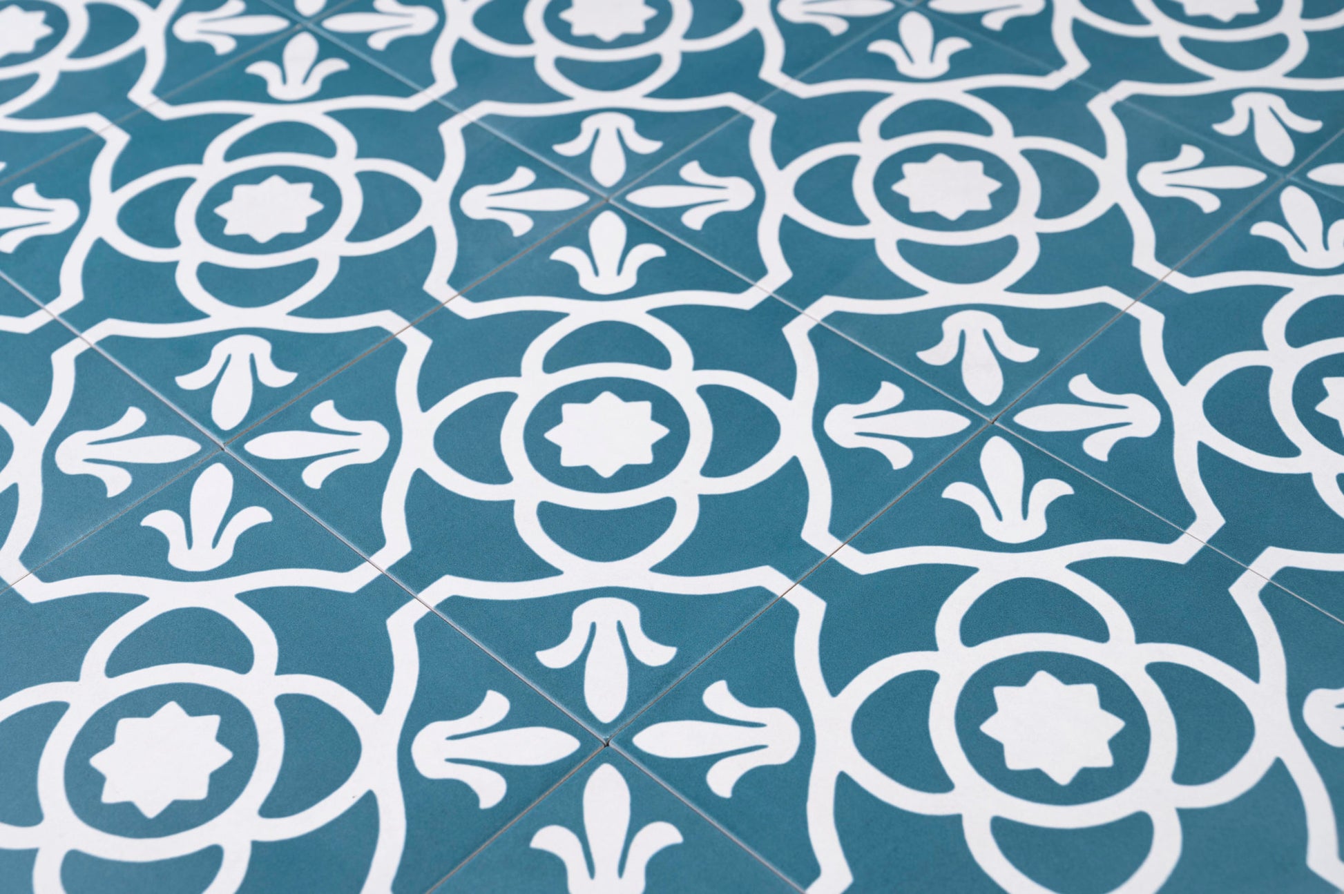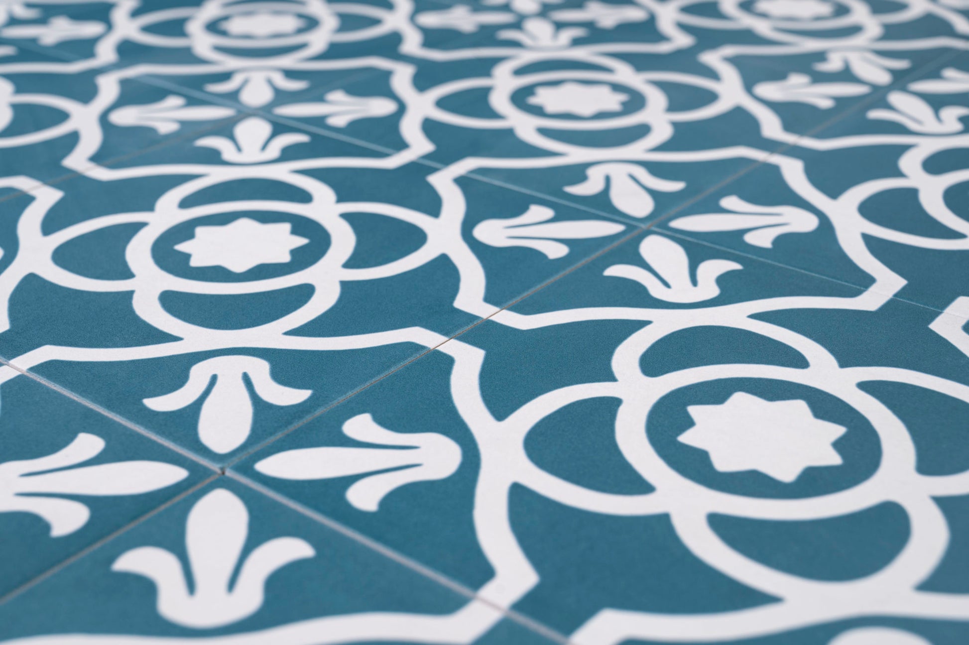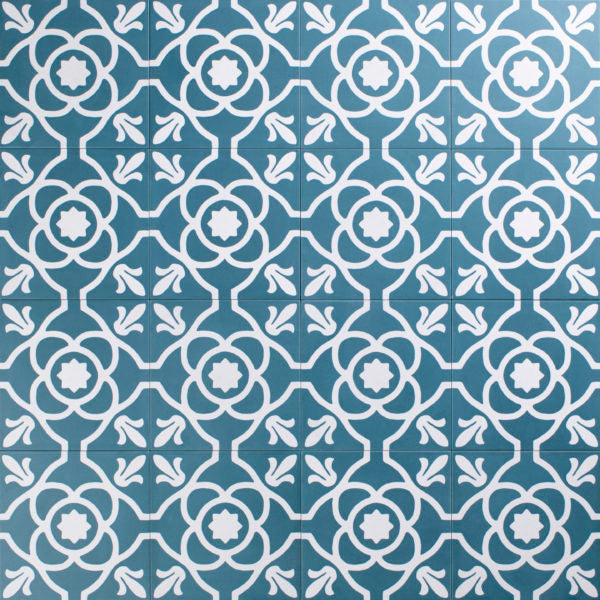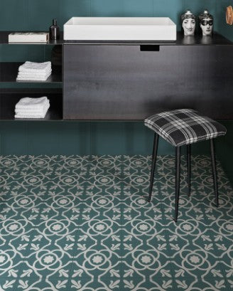 Zementfliesenoptik mit klassischem Dekor in blau/weiß. Rutschhemmung R10/B - auch für den Boden innerhalb einer Dusche verwendbar.