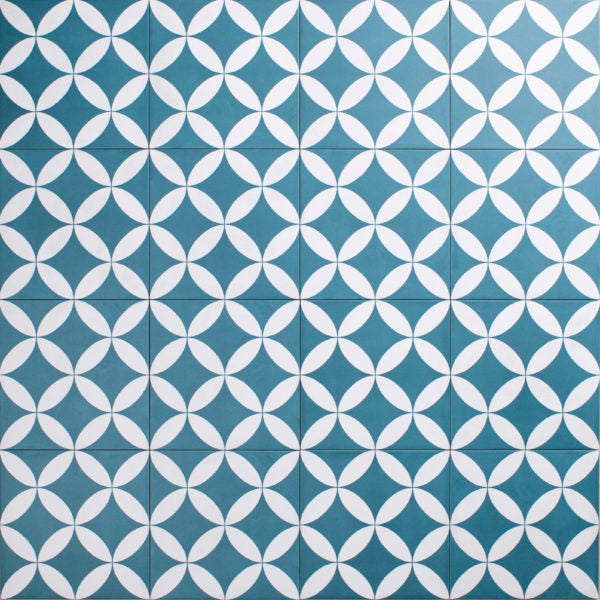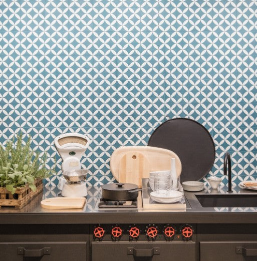 Zementfliesenoptik mit klassischem Dekor in blau/weiß. Rutschhemmung R10/B - auch für den Boden innerhalb einer Dusche verwendbar.